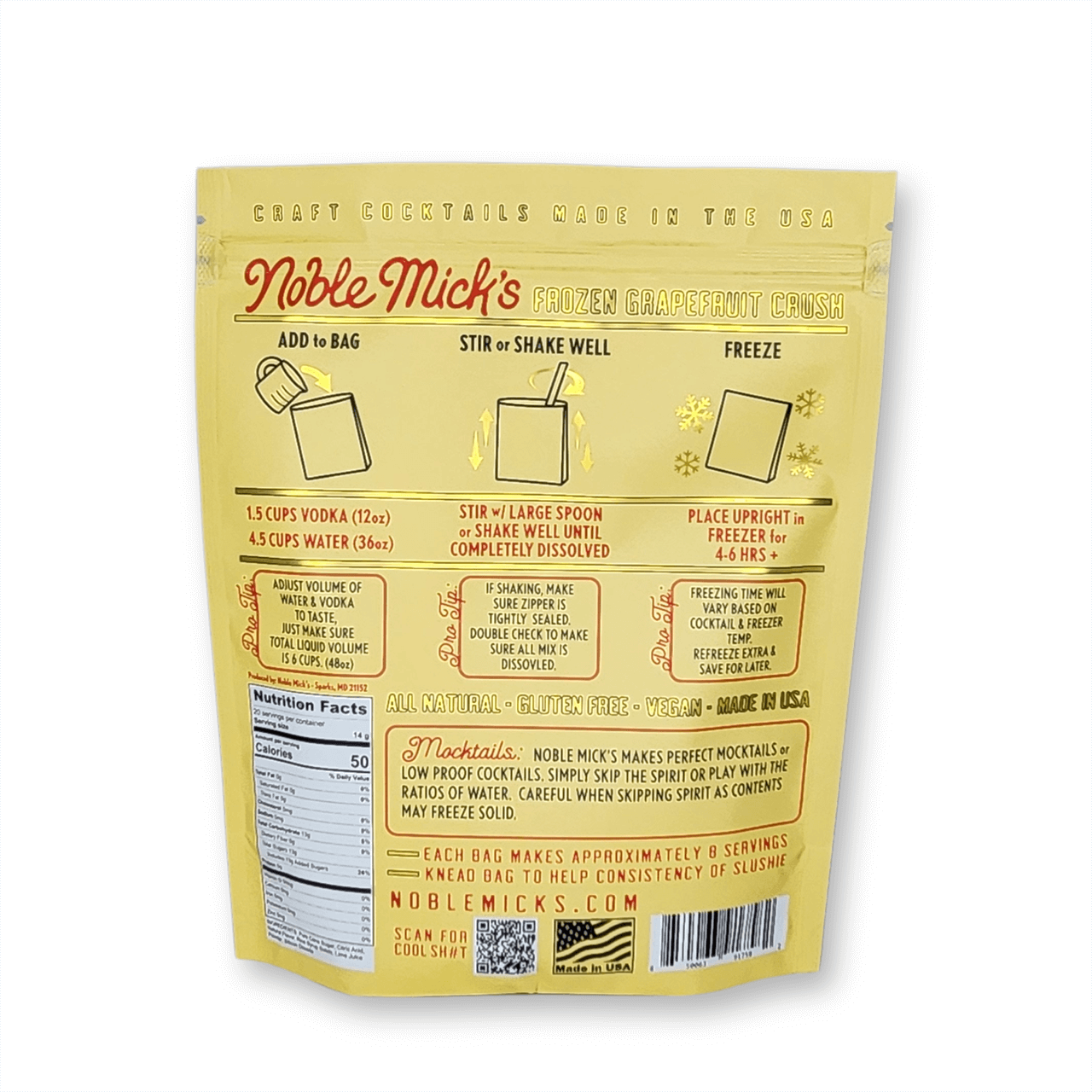 Frozen Cocktails don't get easier than this! Each bag makes 8 servings. No blenders ever! Simply add 12oz Vodka and 36oz water shake or stir and throw in the freezer. 100% all natural ingredients and perfect to share with friends and family at your next party. Cheers from Noble Mick's