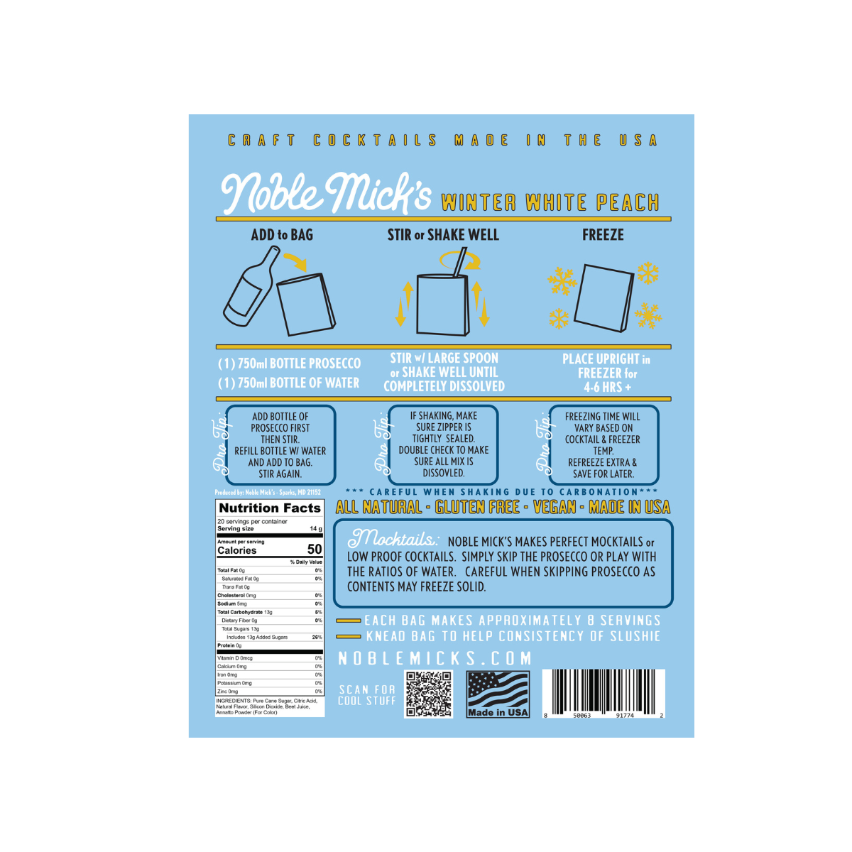 Frozen Cocktails don't get easier than this! Each bag makes 8 servings. No blenders ever! Simply add 1 750ml bottle of prosecco and 1 750ml bottle of water, shake or stir and throw in the freezer. Then serve right from the bag.